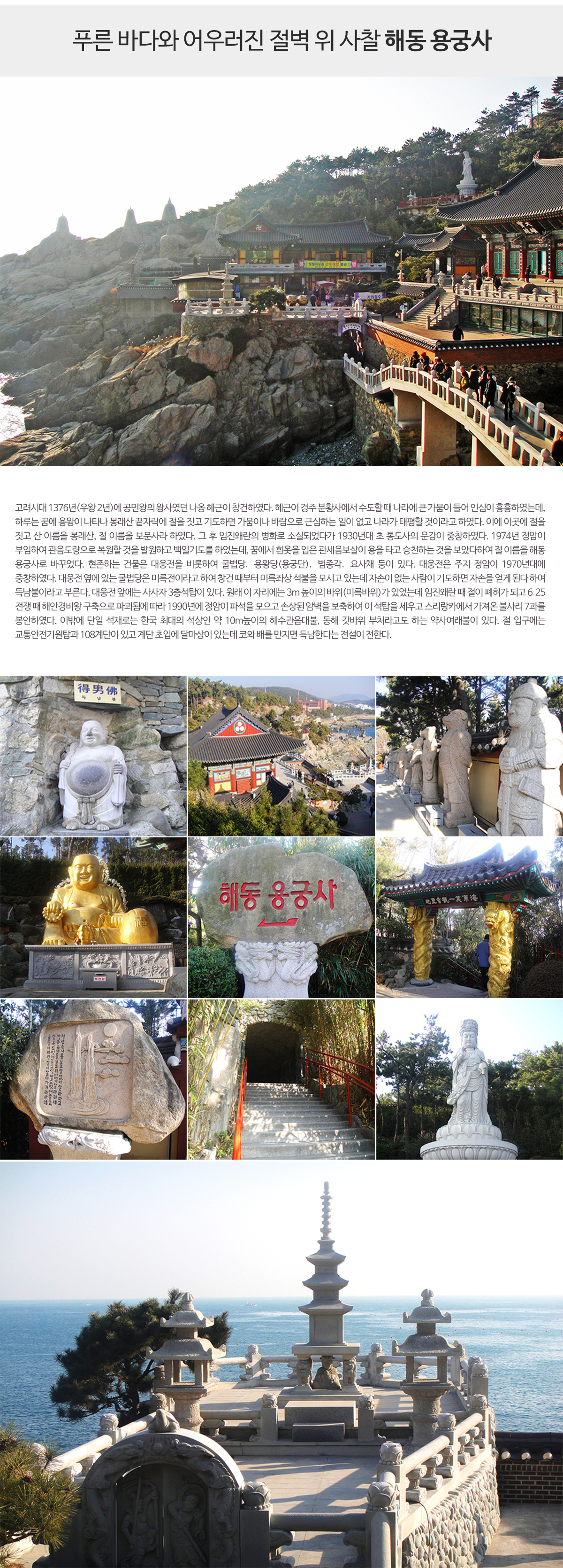 - 바다와 용과 관음대불이 조화를 이루어 신앙의 깊은 뜻을 담고 있는 절