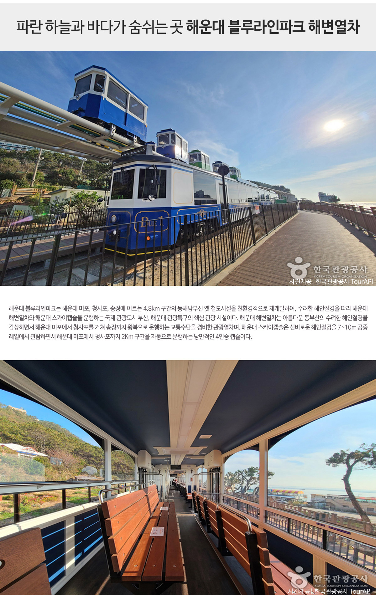 - 수려한 해안절경을 감상하면서 해운대 미포~청사포~송정까지 운행하는 교통수단을 겸비한 관광 열차